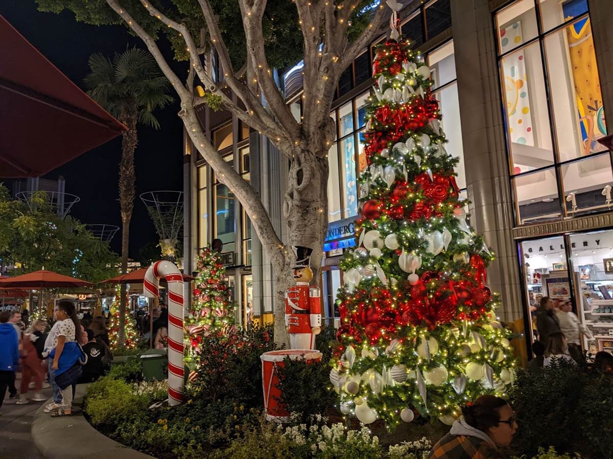 Various Christmas trees and icons, such as Nutcrackers, can be found in the planters throughout Downtown Disney.