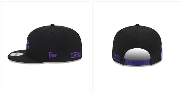 - Additional details include the Marvel logo next to a snapback closure at the rear and a purple undervisor.