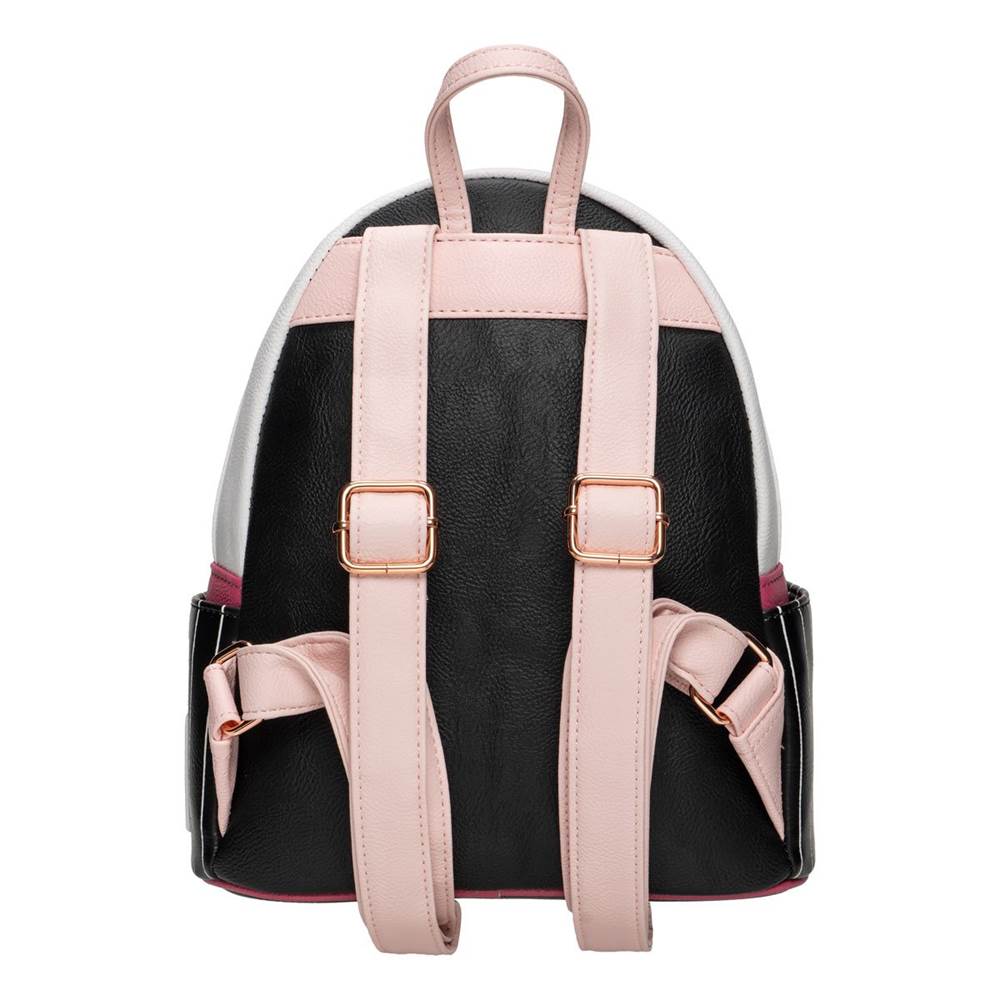 - Features include top zipper closure, a front zippered pocket, adjustable straps, matching themed lining, shiny rose-gold hardware, and printed details.