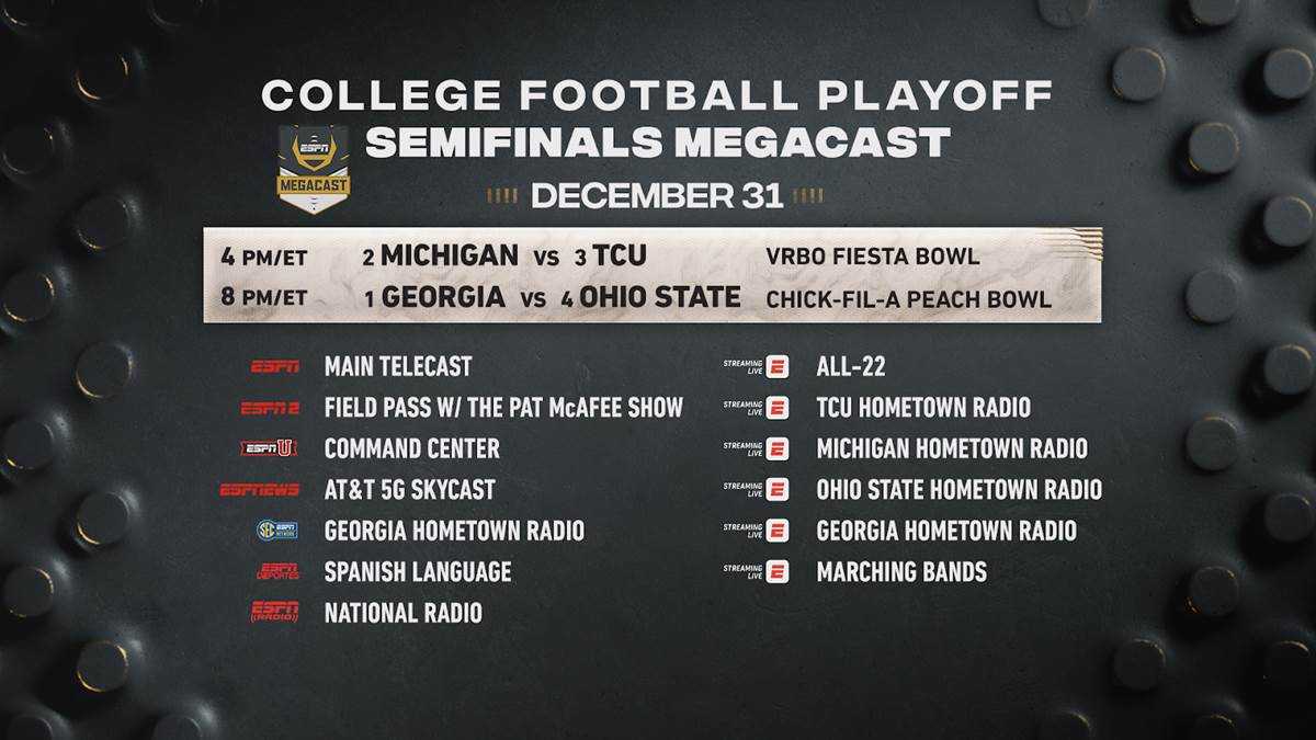 - The College Football Playoff Semifinals MegaCast kicks off with ESPN airing the traditional telecast, which features the network’s innovative technology combined with unique vantage points, providing fans with a state-of-the-art presentation.