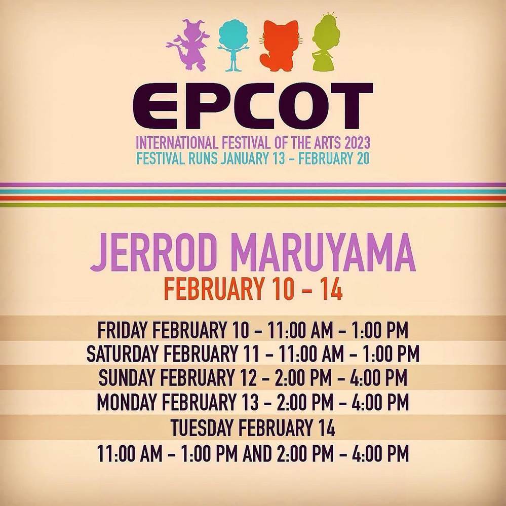 - Maruyama will be appearing at EPCOT’s Odyssey Pavilion, which will be the home to the WonderGround Gallery this year, between February 10th–14th.Those dates and times are: