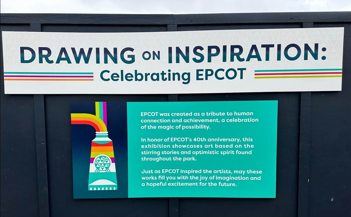 As part of the EPCOT International Festival of the Arts, and in celebration of the 40th anniversary of EPCOT, a new display showcases art based on the stirring stories and optimistic spirit found throughout the park. The exhibit is titled “Drawing on Inspiration: Celebrating EPCOT," and can be found on a set of construction walls near the Imagination Pavilion.