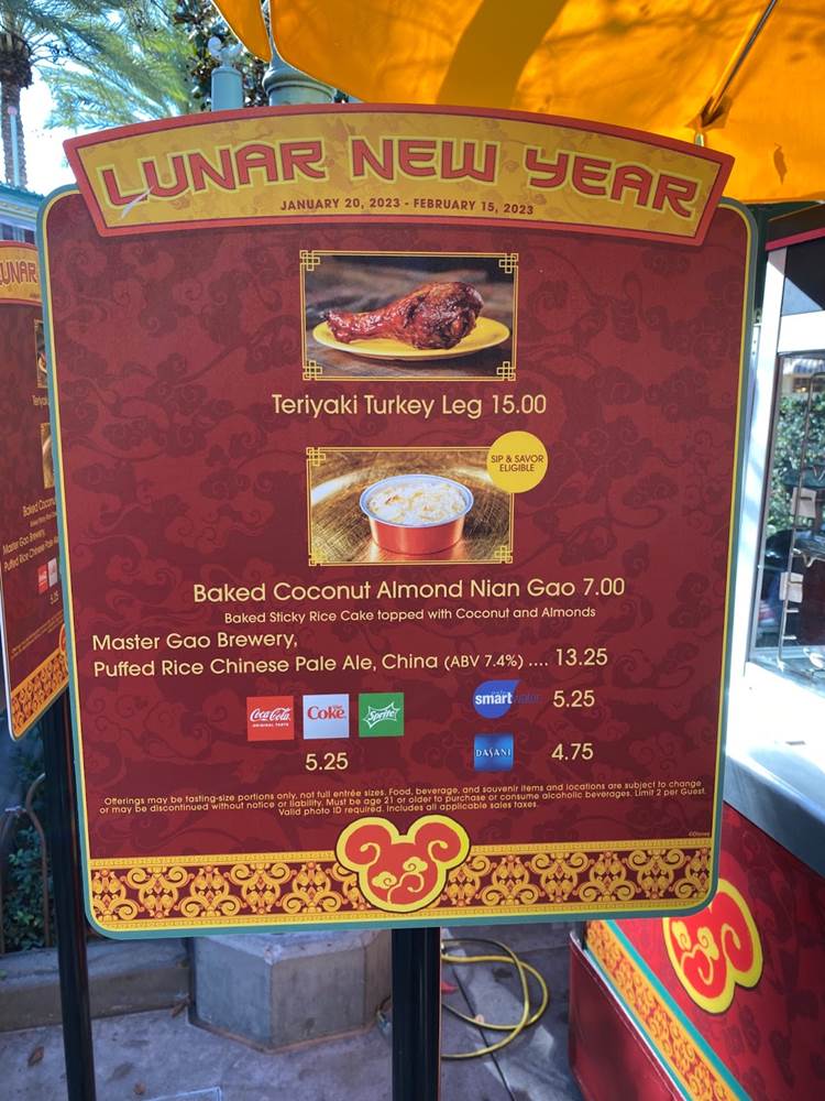 We begin in Paradise Gardens, where a small kiosk features a Teriyaki Turkey Leg and Baked Coconut Almond Nian Gao.