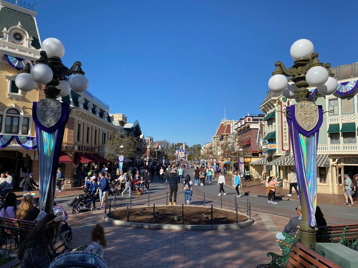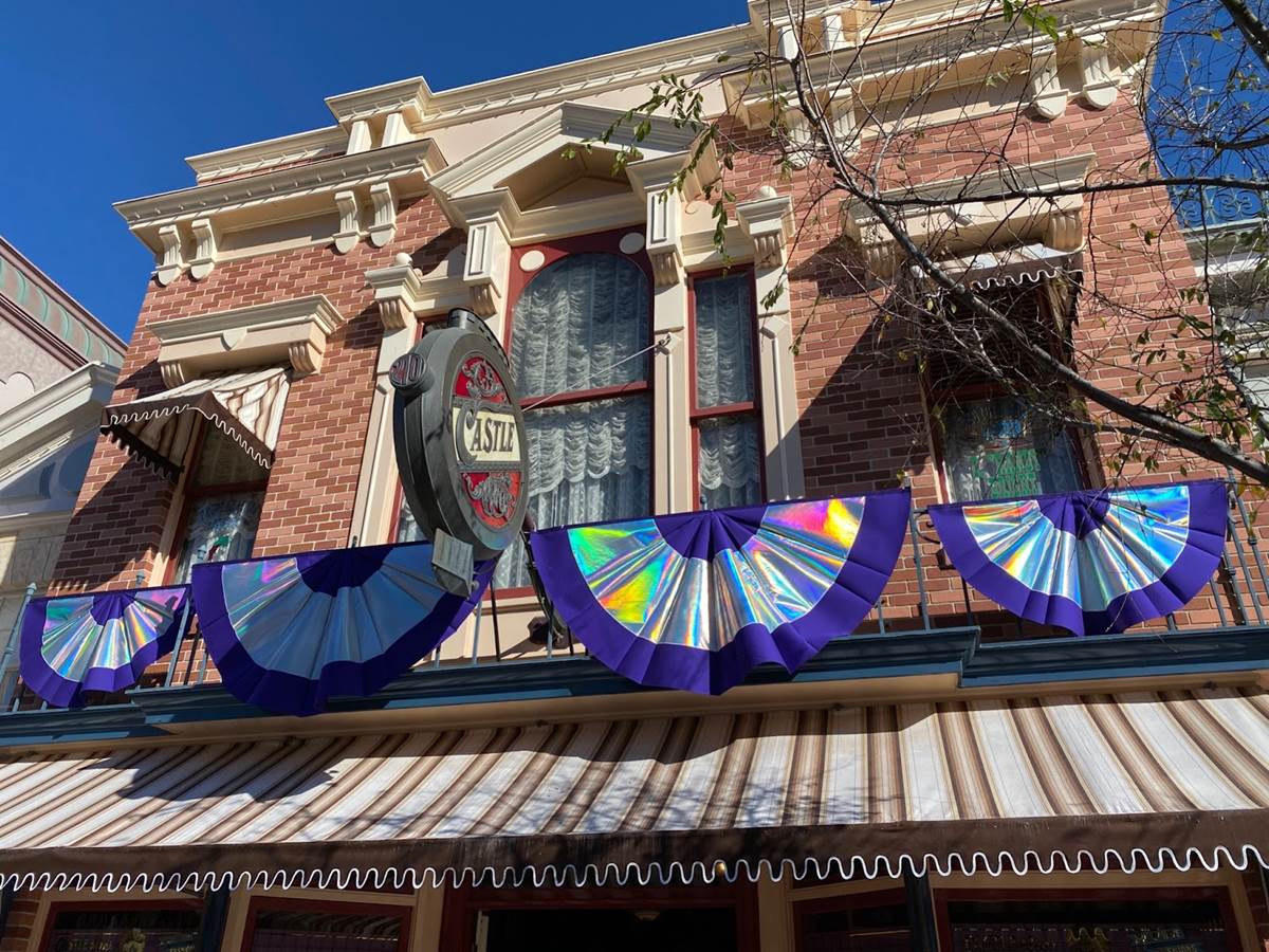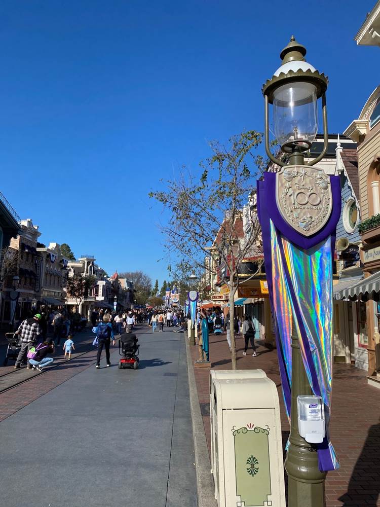 - Stepping into Disneyland Park, guests will find more of the silver and purple platinum decor as they walk down Main Street U.S.A., which has been adorned with medallions and bunting on light posts and storefronts throughout.