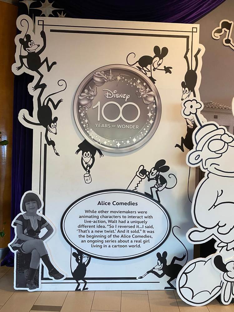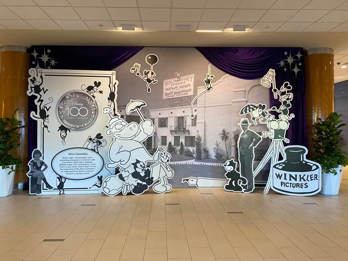 The Disneyland Hotel is celebrating Disney100 with a wonderful diorama featuring Walt Disney and his earliest cartoon creation, the Alice Comedies of the 1920s.