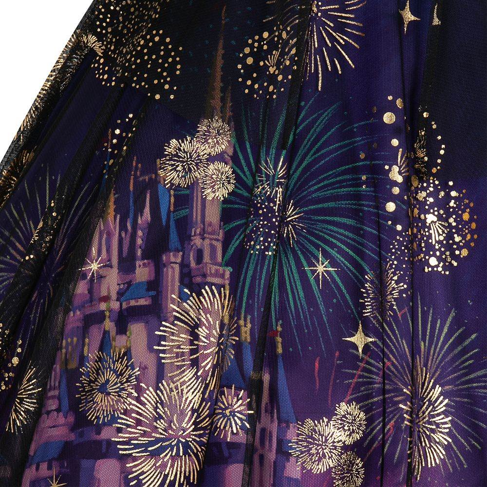 - The dress is decorated with a full Cinderella Castle image and fireworks on the skirt accented with a sheer black overlay featuring golden fireworks.