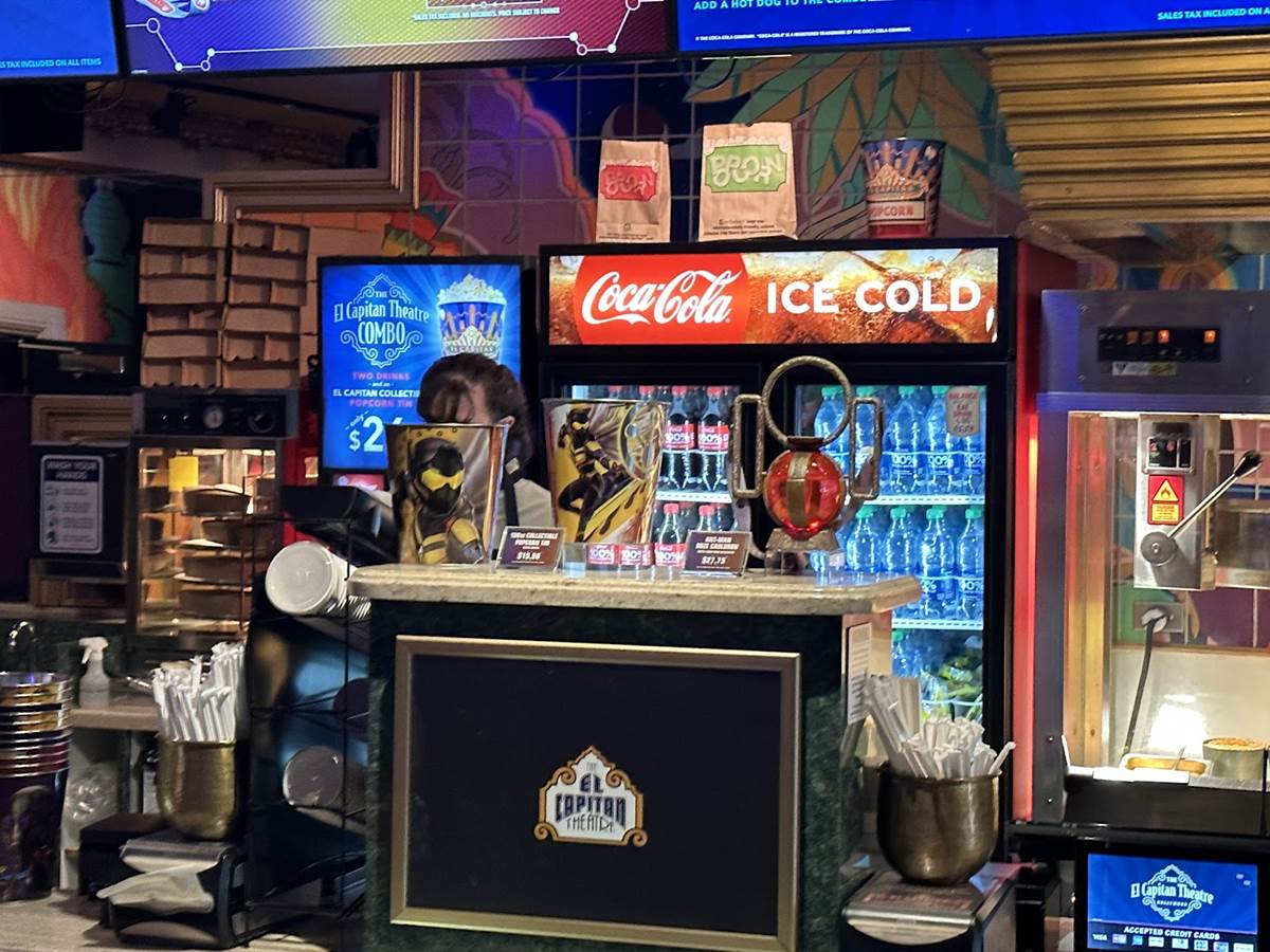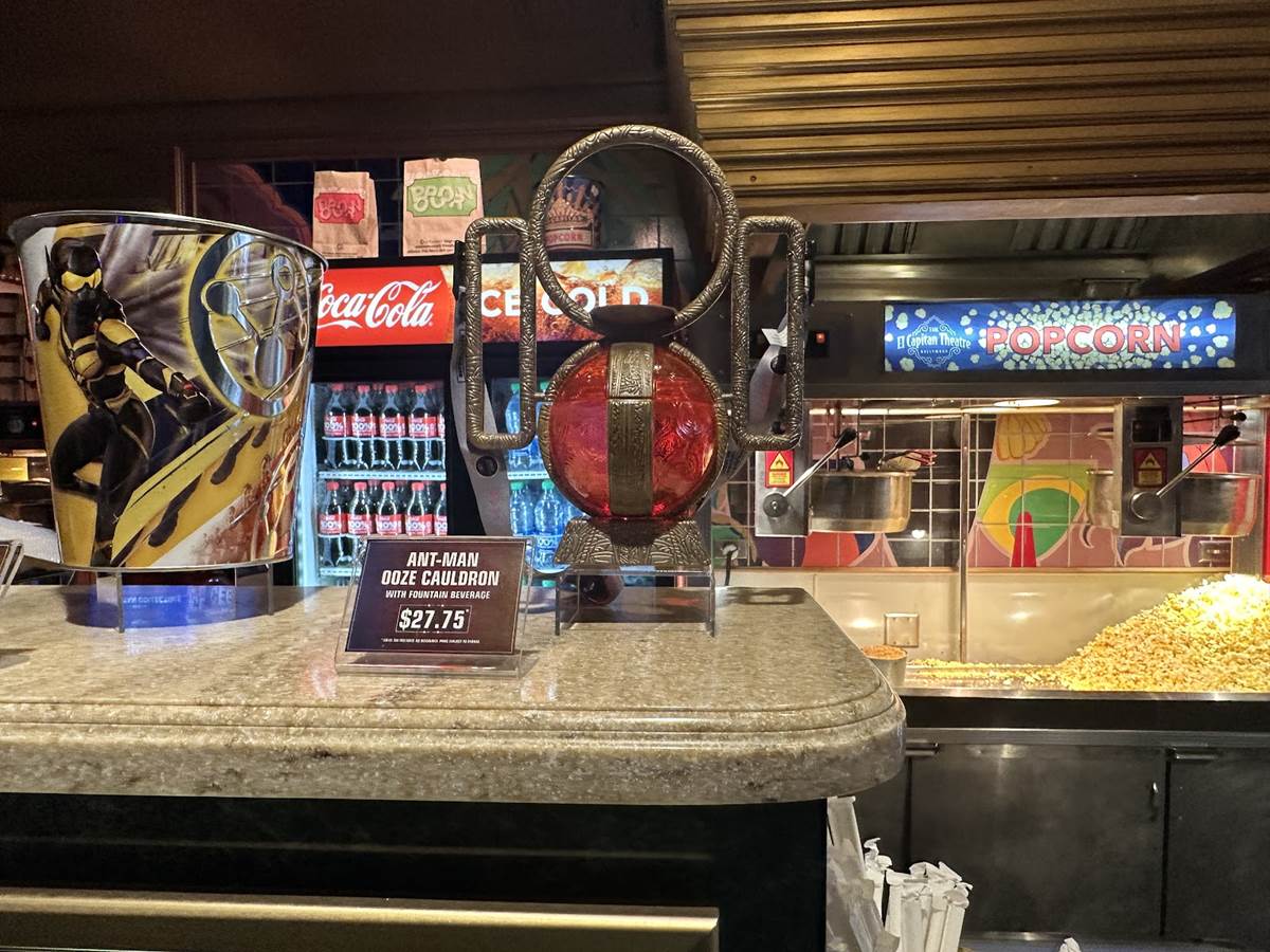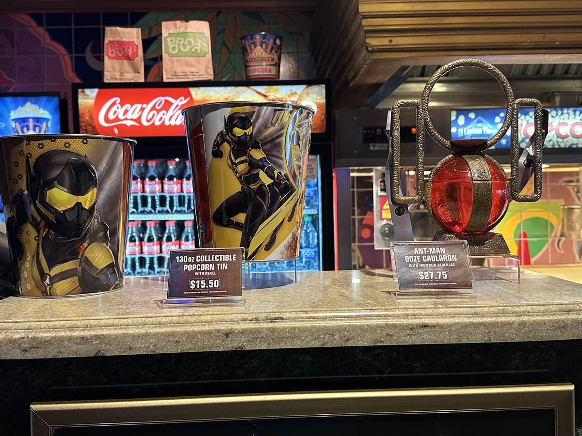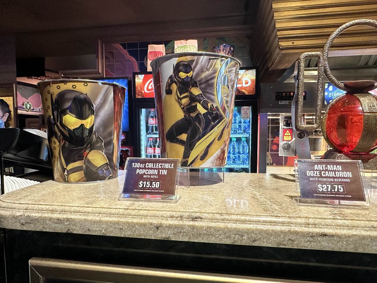 Moviegoers also have the opportunity to take photos with special backdrops that have been installed and with the giant theater ads for the film, one of which features Kang The Conqueror holding out his hand. Speaking of getting their hands on things, fans can get their hands on specialty popcorn buckets and souvenir sippers as well. Similar to the one found at Disney California Adventure’s Avengers Campus, guests at the El Capitan can also find the Ooze Cauldron cup here as well.