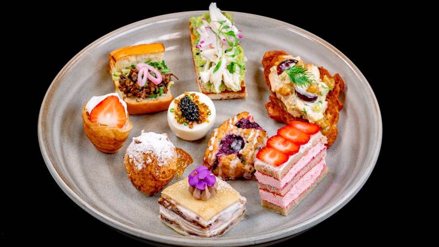 - Tea Service featuring short rib, caviar egg, crab avocado toast, monte fritter, Creole chicken & apple-pecan salad po’boy, crepe layer cake, blueberry-almond scone (Plant-based), strawberry shortcake (Plant-based), strawberry-chocolate cream puff, and an assorted selection of tea (New)