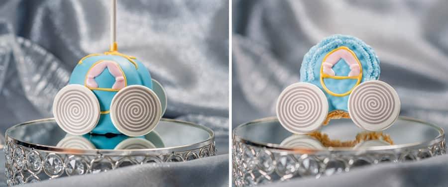 - Cinderella Carriage Crisped Rice Treat: Crisped rice treat dipped in blue white chocolate and decorated with pink and gold white chocolate and white chocolate wheels.