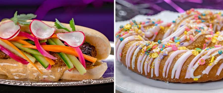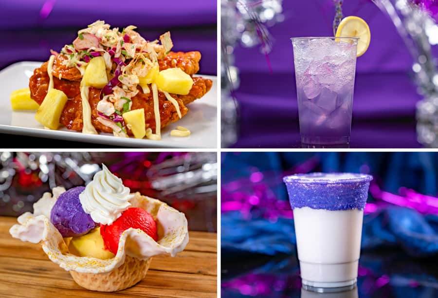 - Tea Time Lemon Funnel Cake dipped in lavender citrus-infused condensed milk topped with edible glitter, purple sugar, lemon sorbet, basil blossoms, and candied hibiscus (New)
