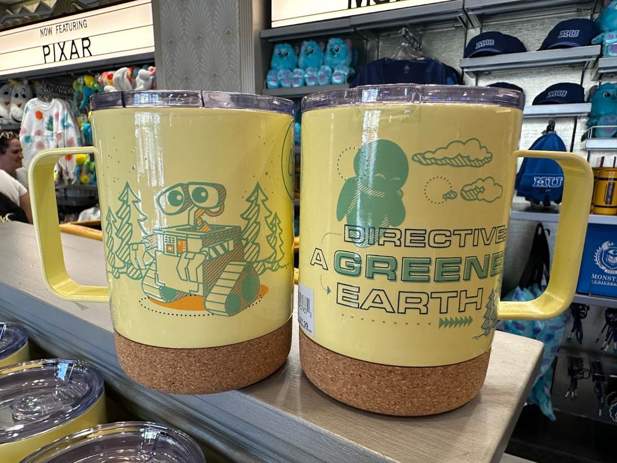 - The environmentally conscious couple of WALL•E and E.V.E. proclaim their directive of ''A greener Earth'' on this stainless steel travel mug. The double-walled design will keep the temperature of the contents stable and the clear lid has a silicone seal and a slider opening for safe sipping on the go.