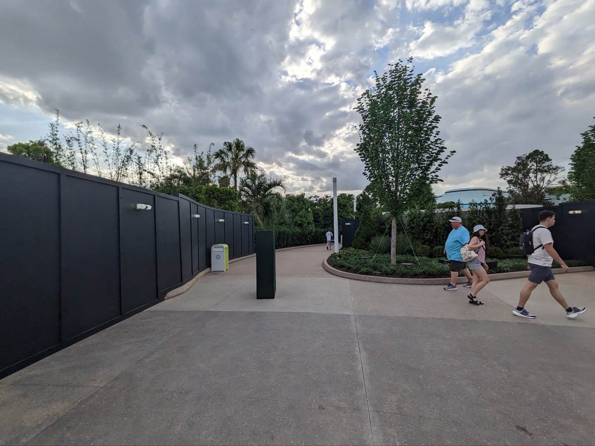The pathway opens up to the west exit of Spaceship Earth, which has been blocked off for many months now.