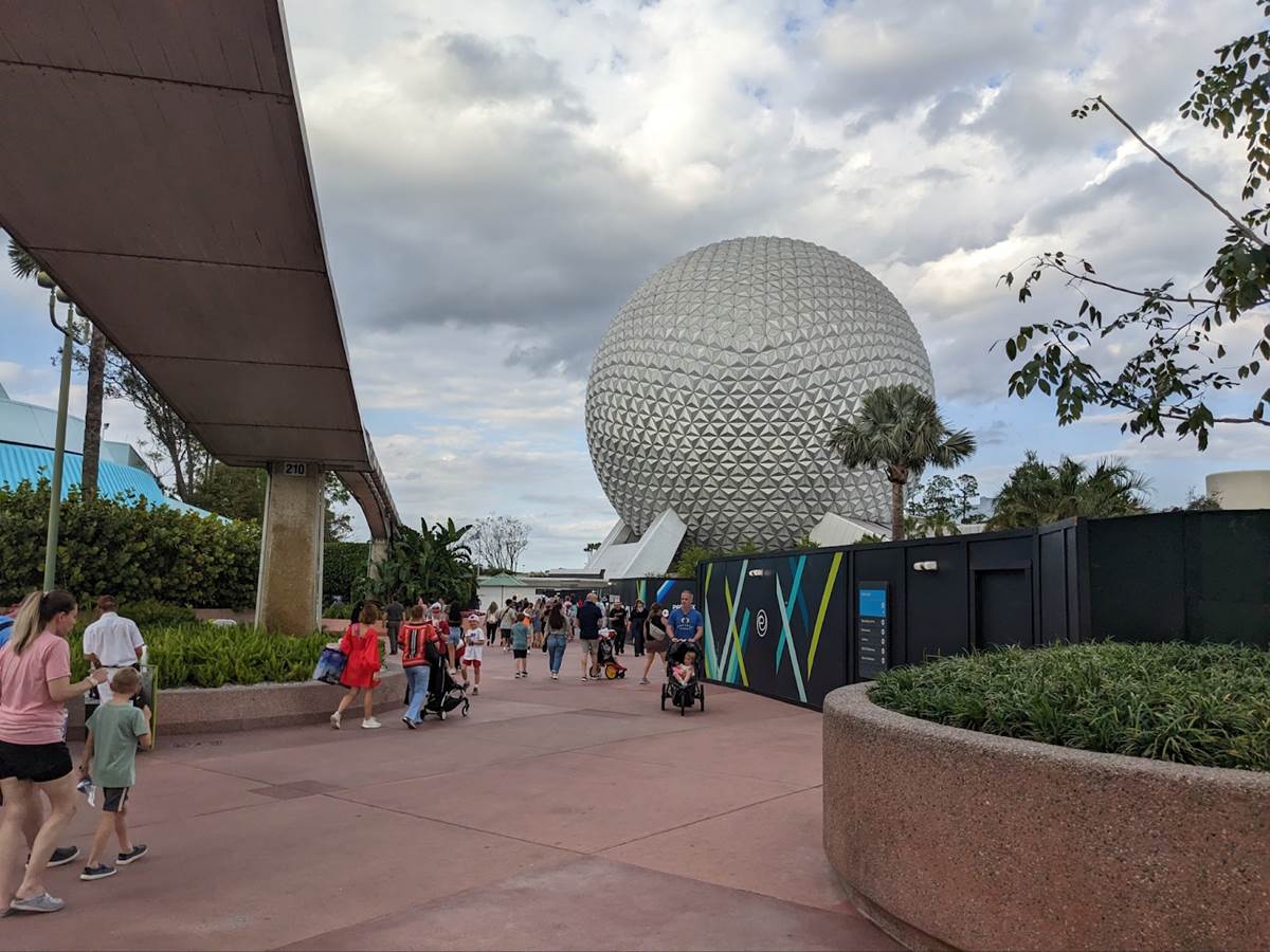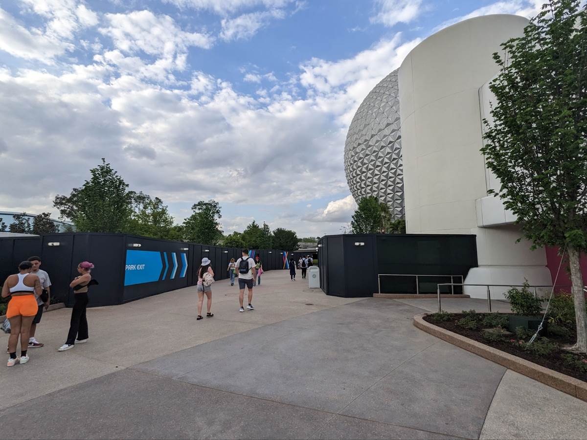 From here, guests can proceed under Spaceship Earth and towards the park exit.