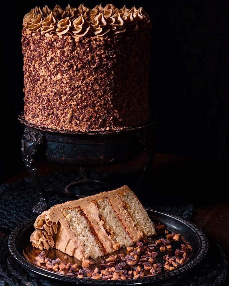 - This towering behemoth features three layers of a Vanilla Coffee Bean Cake smothered in signature thick layers of Coffee Buttercream and filled with Crunchy Toffee Pieces.