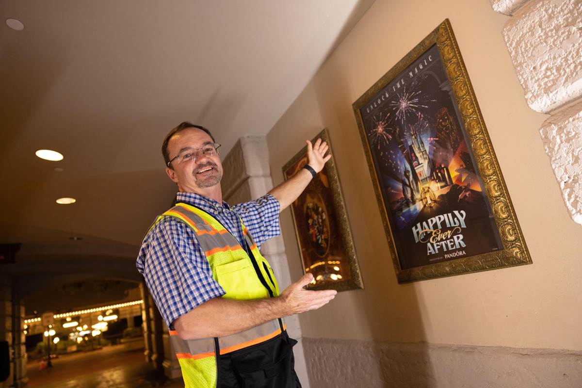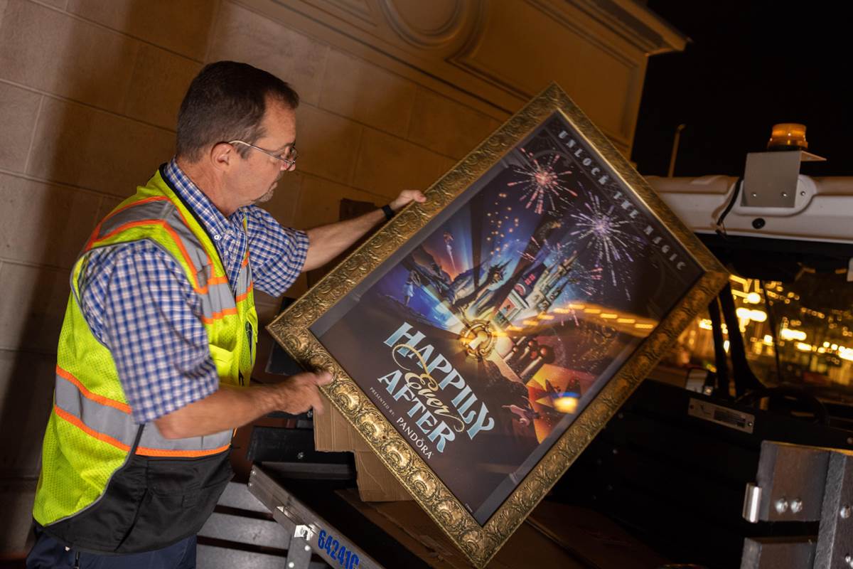 - In these photos shared by the Disney Parks Twitter account, an Imagineer is shown placing the Happily Ever After attraction poster in the train tunnels at the entrance to Main Street, U.S.A.