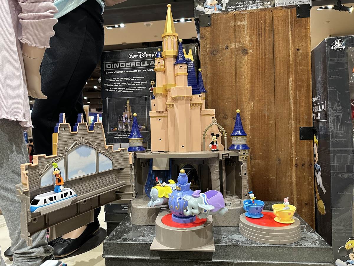 - Join Mickey and his friends as they have a fun time at Cinderella Castle with this playset featuring lots of exciting features including lights, sounds, and even a dramatic ''firework'' display. Standing two feet tall it opens up to reveal motorized attraction rides, an elevator stage, monorail, slide, plus five poseable figures so you'll feel like you're visiting The Most Magical Place on Earth.