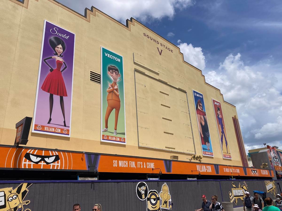 - Since our last update in March, the attraction’s entrance has seemingly been completed, with a big Villain-Con marquee.