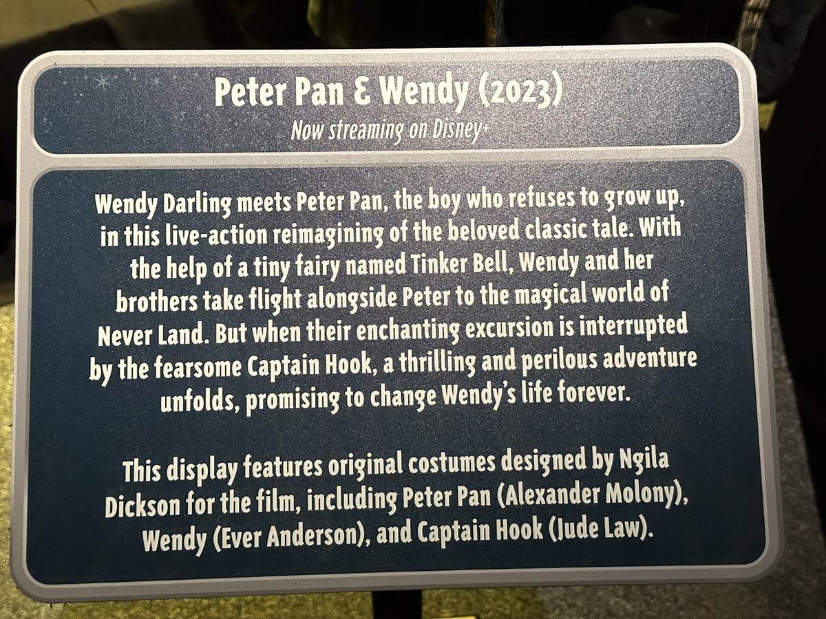 - Located in “Walt Disney Presents" at the park, the display features costumes worn by Peter Pan, Captain Hook, and Wendy Darling in the film.