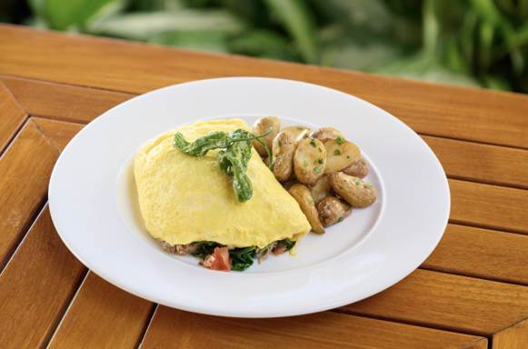 - Three Egg Omelet with Aulani Potatoes – Choose three toppings from a wide variety of ingredients – including bacon, Portuguese sausage, tomato, onion, red bell pepper, cheddar, Swiss and more – and then enjoy your made-to-order omelet with a side of flavor-packed Aulani potatoes.