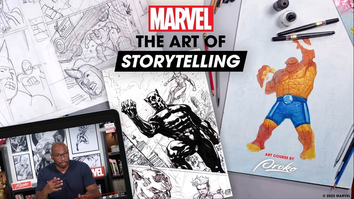 - Marvel’s The Art of Storytelling is split into 9 lesson groups, covering essential topics such as scriptwriting, thumbnailing, character design, and coloring. Students will gain hands-on experience and valuable insights from seasoned Marvel artists and storytellers.