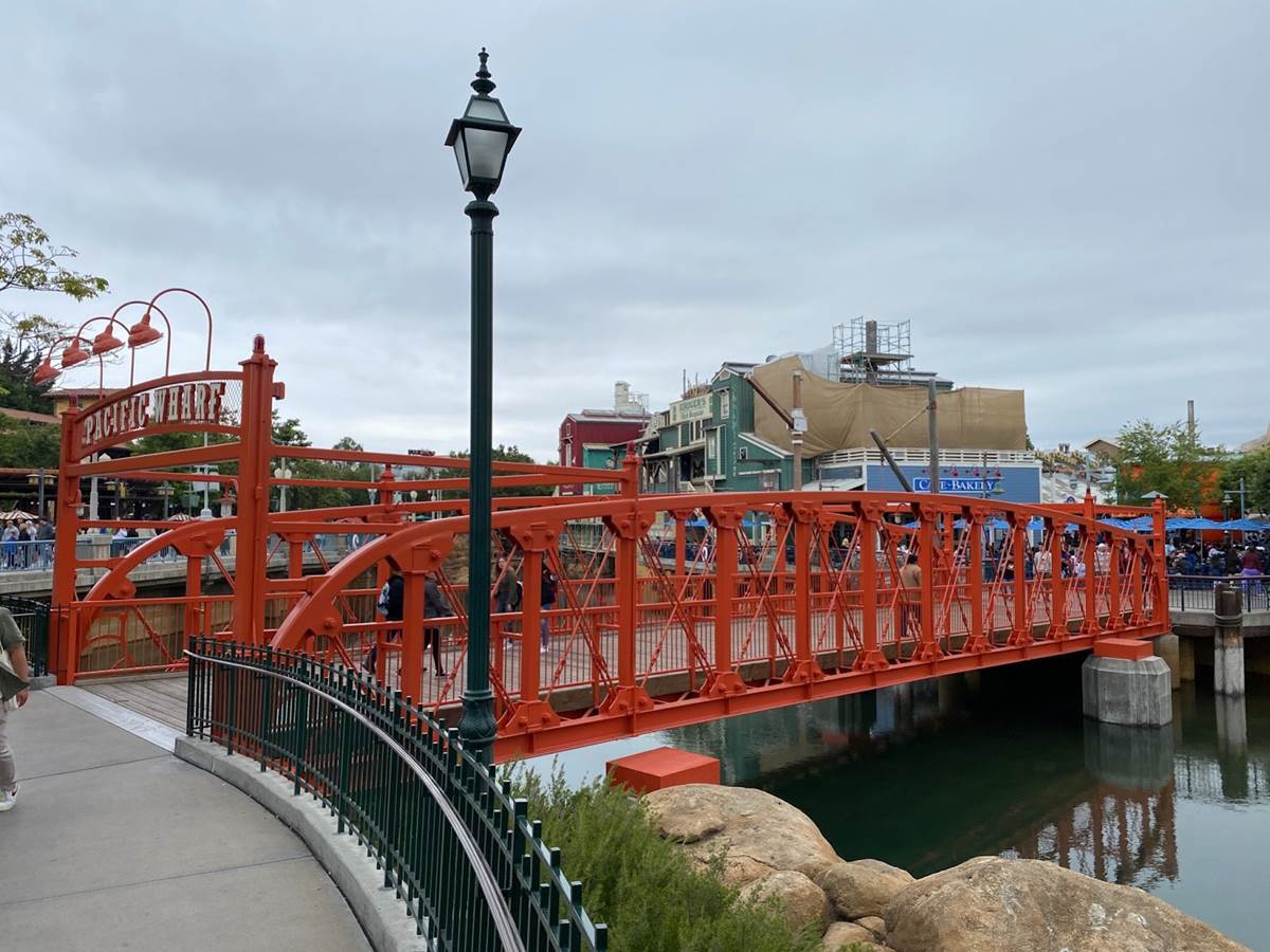 The bridge to Pacific Wharf has been painted red, but has yet to receive its full Golden Gate Bridge-esque makeover.