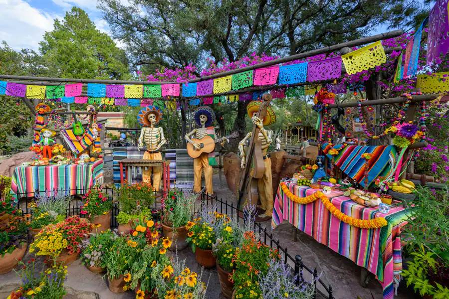 - Disneyland Park will pay tribute to Día de los Muertos with its traditional, vibrant display in Frontierland, adorned with marigolds and banners of papel picado. The colorful photo location also features a musical trio of larger-than-life skeleton figurines.