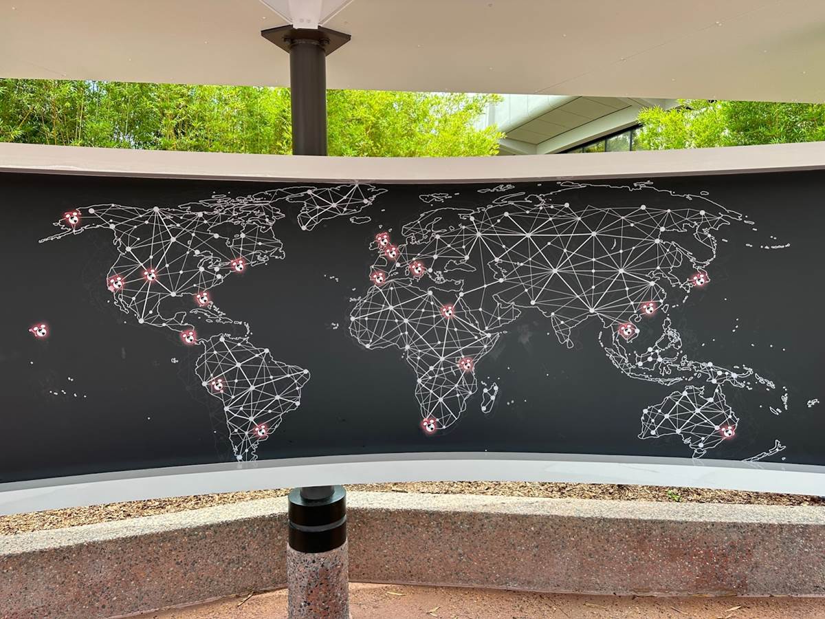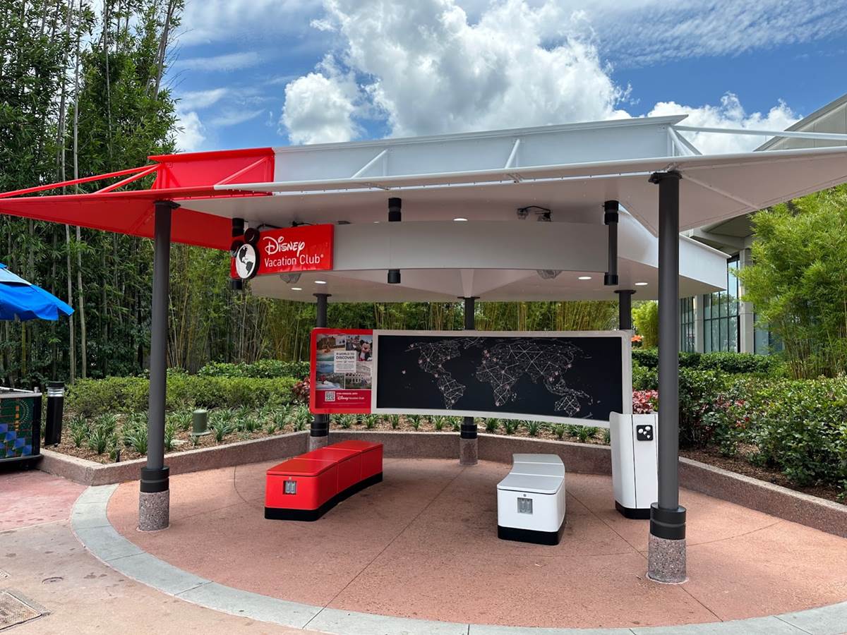 Firstly, the Disney Vacation Club booth located just past Club Cool has been repainted with the World Discovery red and white color scheme. A new map of Disney Vacation Club across the globe has been installed, along with new benches featuring charging ports.