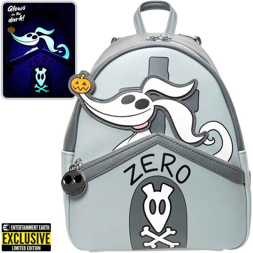 - As for the Nightmare Before Christmas bag, this mini backpack features the spirited dog Zero on the front rising above his dog house. Inside are a doggy skull and crossbones and behind him is a cross that looks like a grave marker. Zero and the crossbones glow in the dark giving this bag an extra dose of Halloween fun.