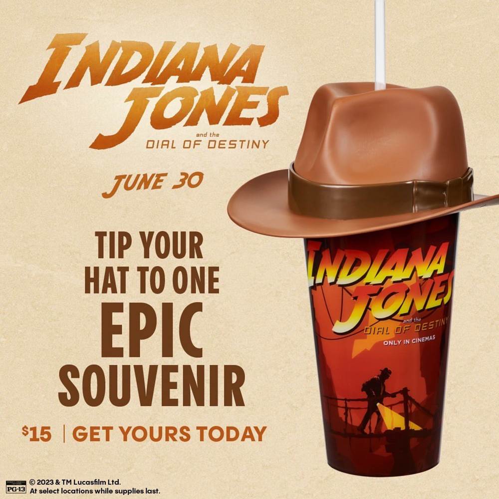 - While supplies last, you can purchase an Indiana Jones popcorn tin for $16 or a souvenir cup for $15.