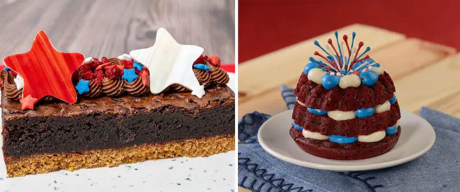 - Star-spangled Brownie Bar: Graham cracker crust and chocolate chip fudgy brownie topped with a brown butter caramel mousse, popping candy, and chocolate décor