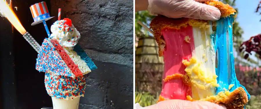 - Red, White, and Blue CakeShake: Vanilla shake featuring a vanilla frosted rim with red, white, and blue sprinkles topped with red, white, and blue cake, whipped cream, more sprinkles, and a cherry