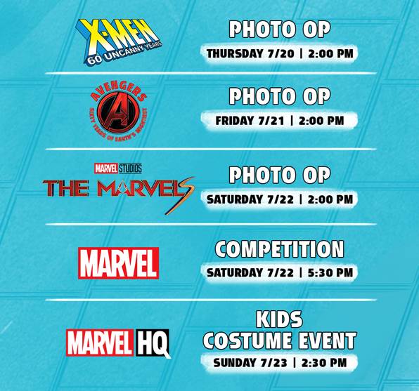 - Additionally, Marvel has shared a schedule including five different cosplay events including three photo ops themed to X-Men, Avengers and The Marvels.