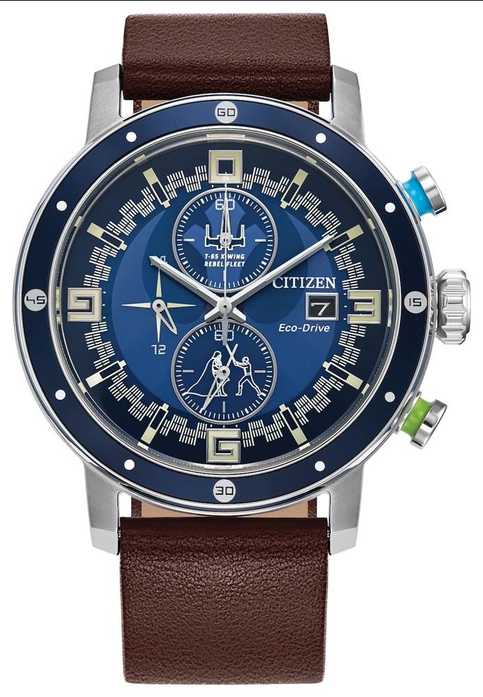 - Inspired by the daring adventures of the humble farm boy from Tatooine, the fight-ready watch is driven by Citizen’s proprietary Eco-Drive technology to provide light-powered vitality without ever needing a battery. A silver-tone stainless steel case with a blue aluminum bezel serves as the canvas for the design, complemented by blue and green accented chronograph pushers representing the colors of Skywalker's lightsabers. On the dial, a sectored blue style features an inner motif of the symbol of the Rebel Alliance, while an image of Skywalker's X-wing and a scene of his iconic struggle with Darth Vader mark the top and bottom sub-dials. The watch is presented on a brown leather strap, giving a soft detail to an otherwise robust design and providing an elegant touch to the bold chronograph.