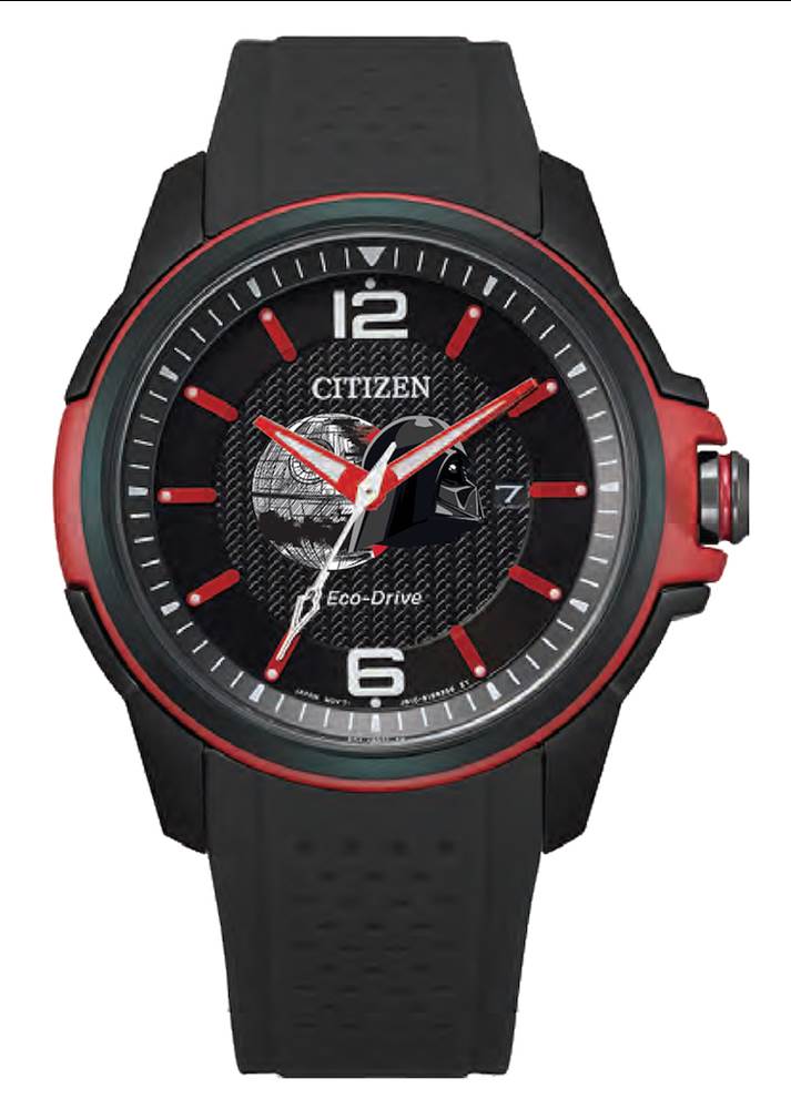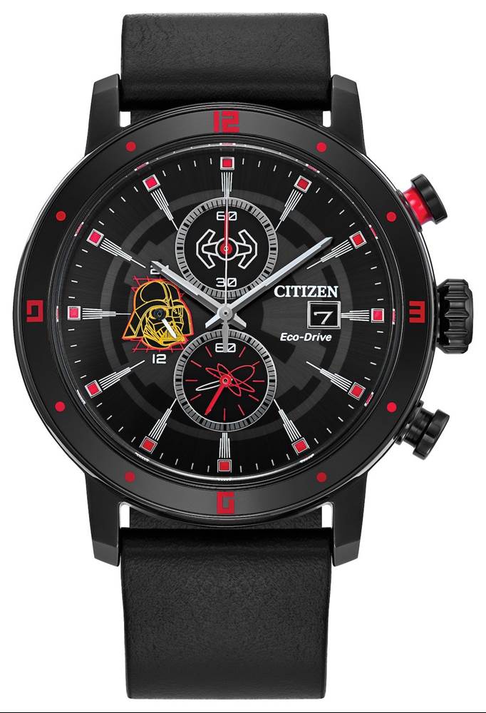 - The 44mm chronograph is bold in a black IP case, channeling the dark dominance of the Sith Lord with red detailing throughout and a unique case back reading, “Come to the Dark Side." The chronograph functionality is able to measure ⅕ second up to 60 minutes. An illustration of Darth Vader’s helmet, a TIE fighter, and details from a starfighter’s screen decorate the display's sub-dials, while along the periphery of the dial luminous crimson hour markers harken to the Sith's iconic red lightsaber. The watch is sustainably powered by Citizen’s proprietary Eco-Drive technology, so it’ll never need a battery. Caliber number B612.