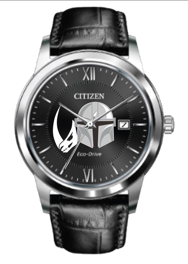 - This exceptional timepiece features the iconic Mandalorian Helmet and the revered Mud horn symbol, showcased on a classic 40mm silver-tone stainless steel case with a captivating black dial. The watch is completed with a sleek black leather strap, combining style and comfort.