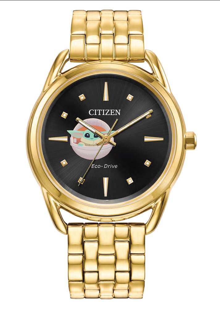- This collector's timepiece showcases Grogu in his floating pram on a sleek black dial. The 36mm gold tone stainless steel case and bracelet add a touch of elegance and sophistication.
