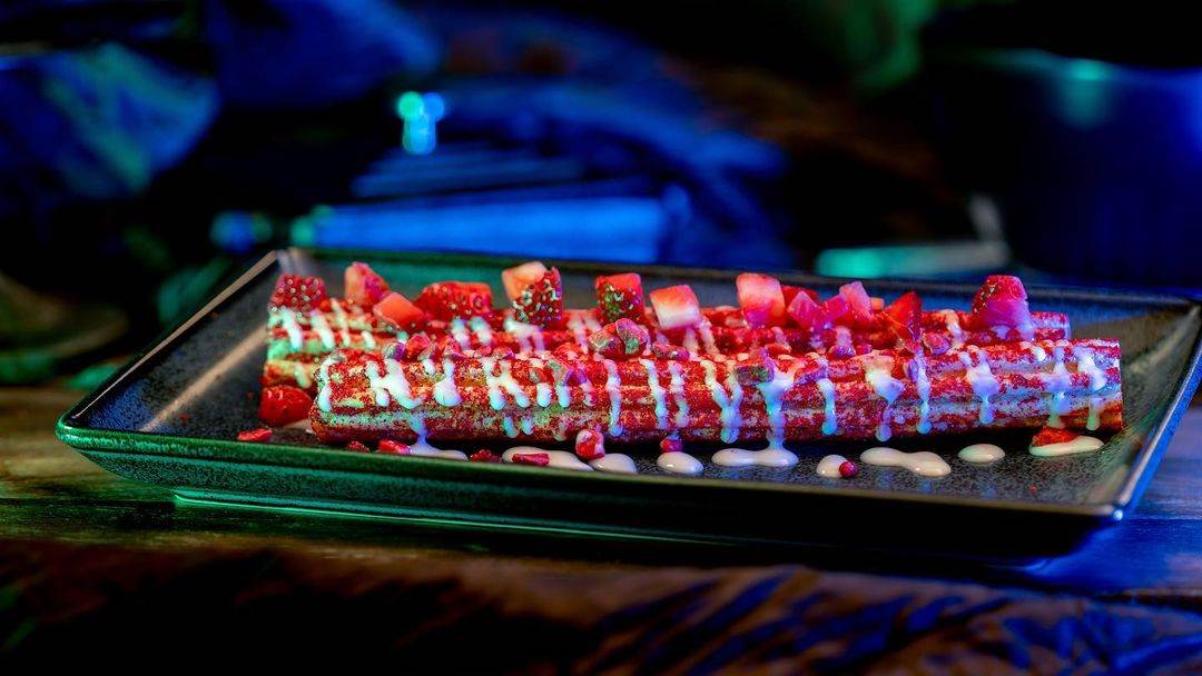 - April-December Churro at the New Orleans Square Churro Cart: Strawberry-flavored sugar with fresh strawberries, purple cherry sugar, freeze-dried strawberries, and donut icing drizzle