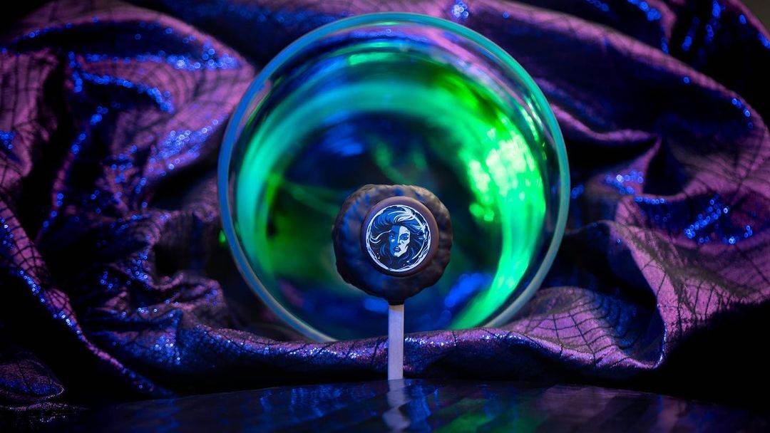 - Crystal ball Cereal Treat at Candy Palace and Candy Kitchen: Cereal treat in black-colored dark chocolate with teal and black M&M'S embellished with a Madame Leotta chocolate piece