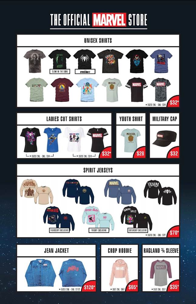 - Fans will want to stop by The Official Marvel Store (#2519) for convention-exclusive merchandise including t-shirts, spirit jerseys, comic book variants, and more! This year’s apparel highlights fan-favorite moments from Spider-Man: Across the Spider-Verse, Guardians of the Galaxy, The Marvels, and so much more. Purchase a Marvel jean jacket and customize it with pins and patches available for sale at the convention.