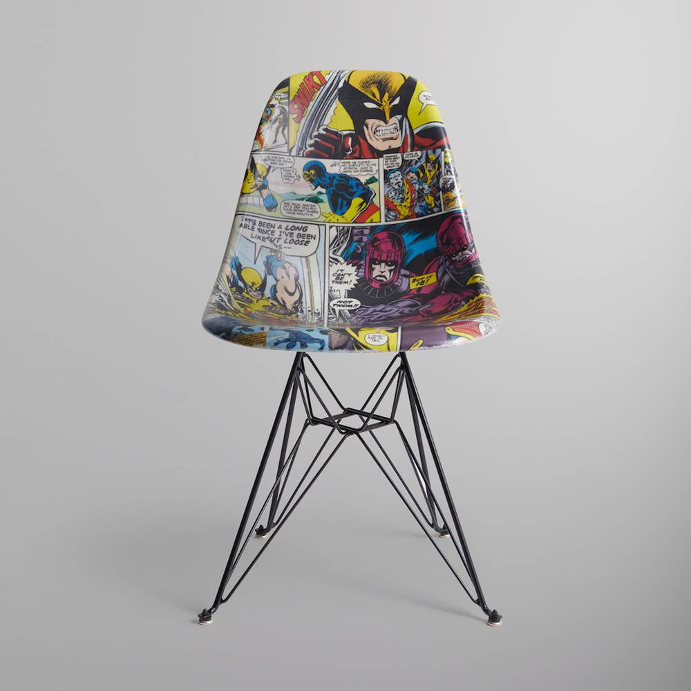 - Both chairs feature wraparound archival X-Men artwork, with one using a vintage comic panel design and the other an illustrated battle against Magneto. The bottom of both styles also includes a custom Kith Home plaque.