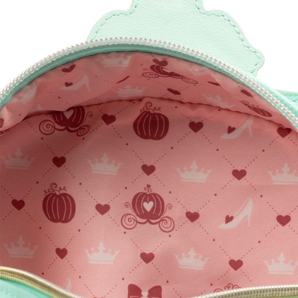 - Of course this is a Loungefly design so you can bet there’s a matching lining to complete the look. The inside has a red and white pattern consisting of pumpkins, crowns, carriages, glass slippers, and hearts, all set against a pink background.