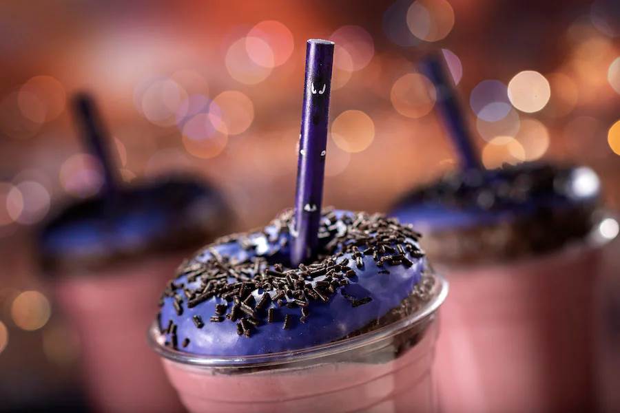 - Happy Haunts Shake at Columbia Harbor House inside the Magic Kingdom: Blackberry shake topped with purple chocolate-glazed doughnut covered with black sprinkles.