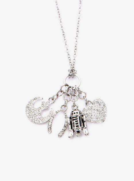 Fans can also dress up their look with this pretty charm necklace that includes gem studded pendants of the Rebellion logo, a horseshoe, heart and R2-D2.