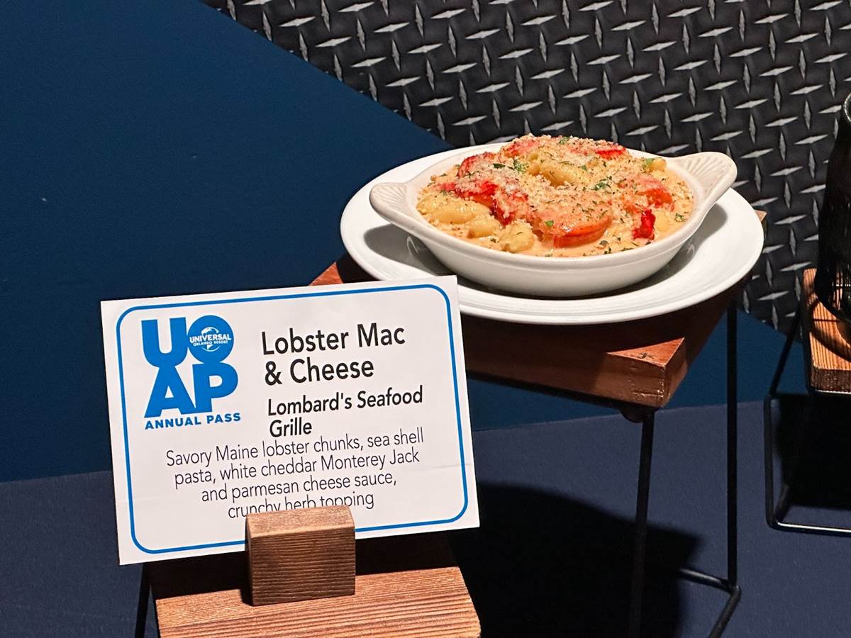 - In Universal Studios Florida, Lombard’s Seafood Grille will be serving the Lobster Mac & Cheese, with savory Maine lobster chunks, white chedda monterey jack and parmesan cheese sauce and crunchy herb topping.