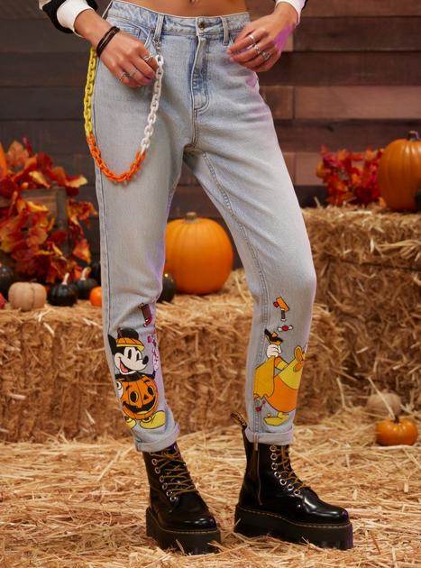 Finally, fans can take one final bold approach with the Mickey Mouse pumpkin sweatshirt featuring a bright orange tie-dye pattern, or opt for the subtler route via Mom jeans embellished with a candy corn colored chain at the hip and screen printed vintage characters around the ankles.