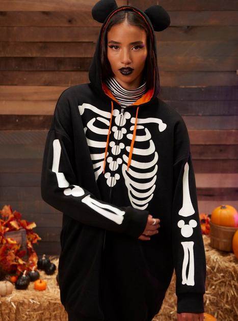 Are hoodies your preferred cool weather option? A bold Donald Duck color block top showcases the surprisingly cheery fowl dressed up as a piece of candy corn holding up a broken candy sack (whomp, whomp). Then for those stretching their fashion muscles, there’s a hoodie dress decorated with a skeleton rib cage and Mickey head spine!