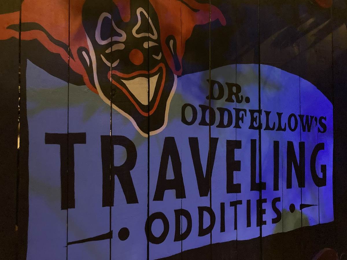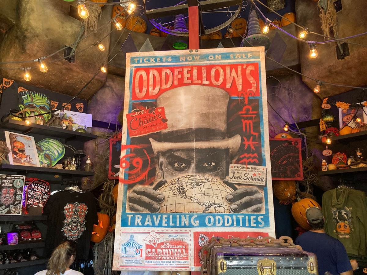 - A large marquee for “Dr. Oddfellow’s Traveling Oddities" greets guests as they enter the store.