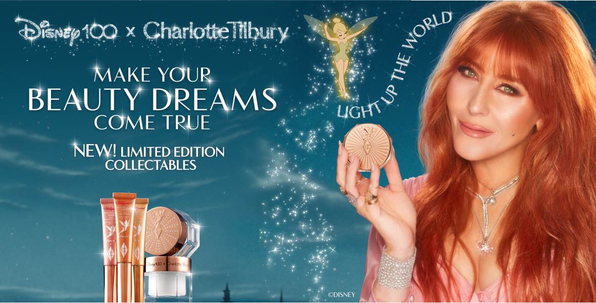 - Receive a free D100 x Charlotte Tilbury pin when you purchase one of her iconic, Disney collaboration products, including Charlotte’s iconic Magic Cream, now adorned with Tinkerbell, and her glowing Beauty Light Wands.