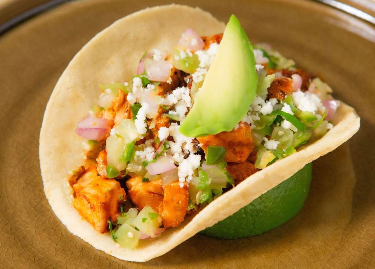 - Red chile chicken taco with avocado, tomatillo, pico de gallo and queso fresco on corn tortillas from Rosa Mexicano