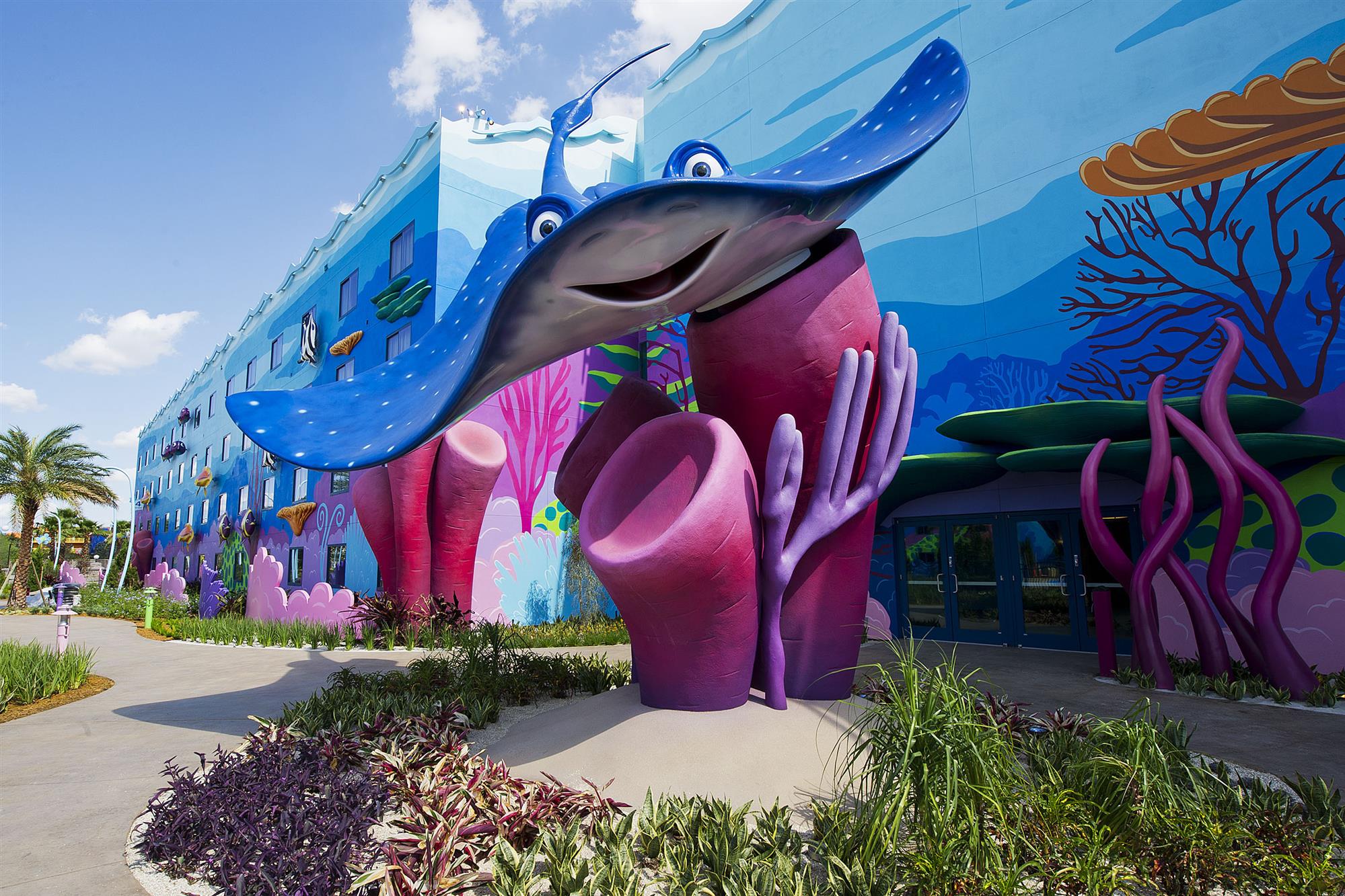 The Art of Animation Resort bases its theme on Disney animated films. The 87 acre resort has themed room interiors in nearly all of the 2,000 units and 864 themed rooms in The Little Mermaid (non-suite) wings. Animation Hall is the main building and houses the front desk, concierge, the Ink and Paint Shop, the Landscape of Flavors eatery, and arcade.